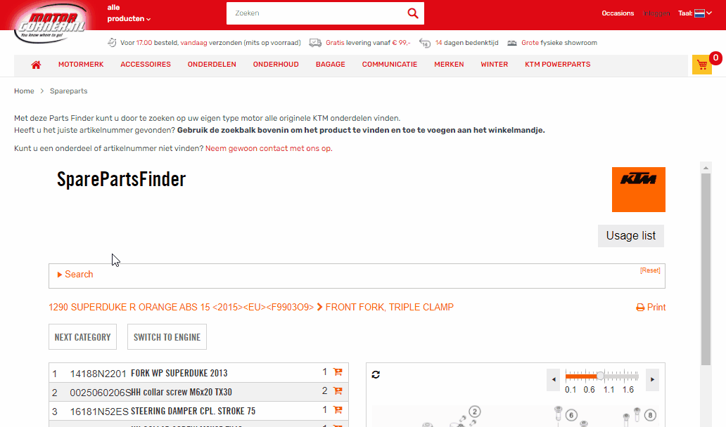 Met deze Parts Finder kunt u door te zoeken op uw eigen type motor alle originele KTM onderdelen vinden.